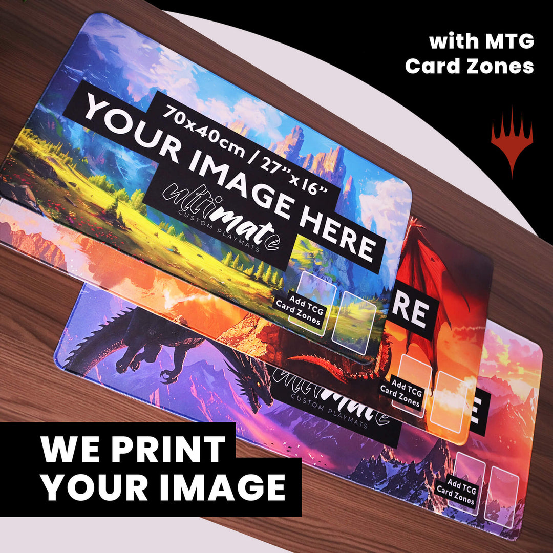 Be the KING at your next game night with a fully customized playmat, complete with card zones from the most popular TCG's.