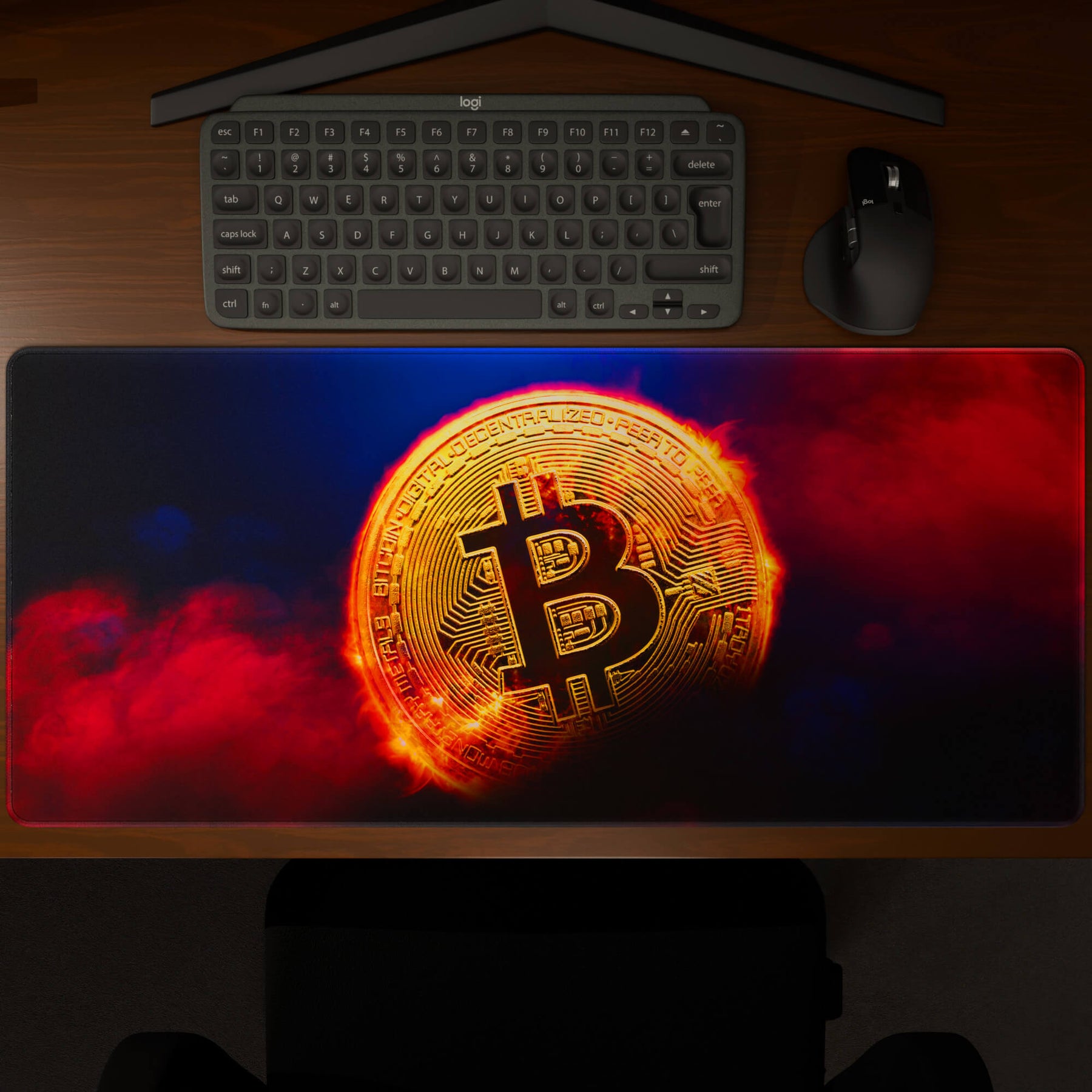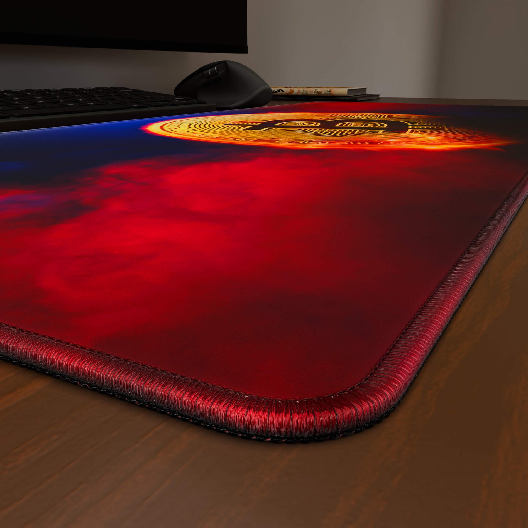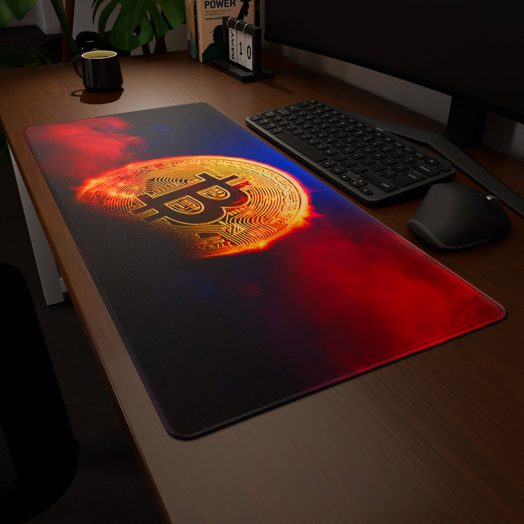 Clean angled presentation of a 90x40CM / 35x15.7in large mouse pad / desk mat showcasing the dramatic 'Bitcoin' design, inspired by crypto and blockchain technology. Its high-quality fabric surface is designed for optical and laser mice, delivering superior tracking performance and responsiveness.