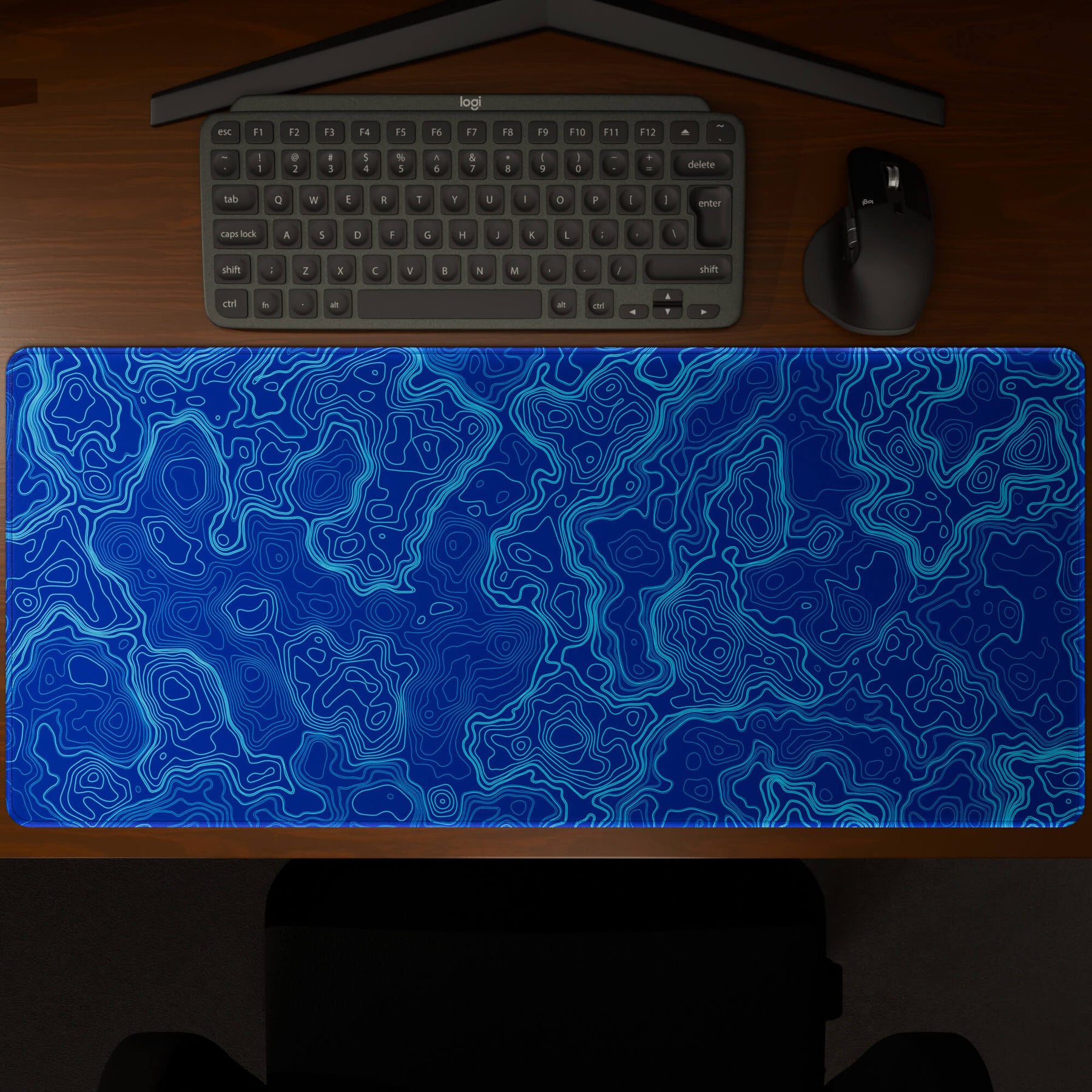 Elevated view of a 90x40CM / 35x15.7in large mouse pad / desk mat prominently displaying the 'Blue Topographic' design, inspired by blue minimalist topographic art. This premium mat provides a stable, non-slip surface, crucial for maintaining focus and accuracy during intense gaming or work sessions.