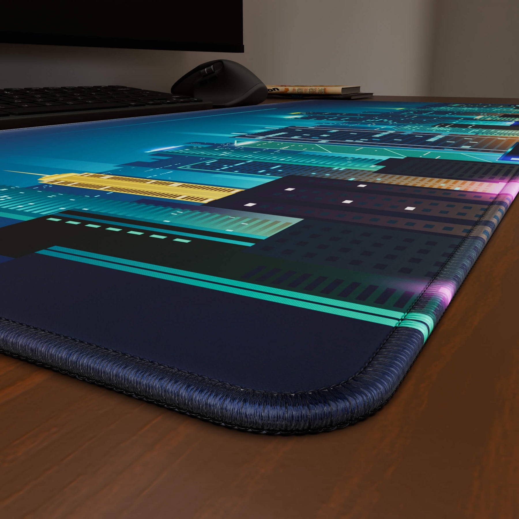 Close-up angled shot highlighting the durable stitched edges of a 90x40CM / 35x15.7in large mouse pad / desk mat with the 'Neon City' design, inspired by cyberpunk cityscape art. The reinforced stitching prevents fraying, ensuring long-lasting durability and a consistently clean aesthetic.