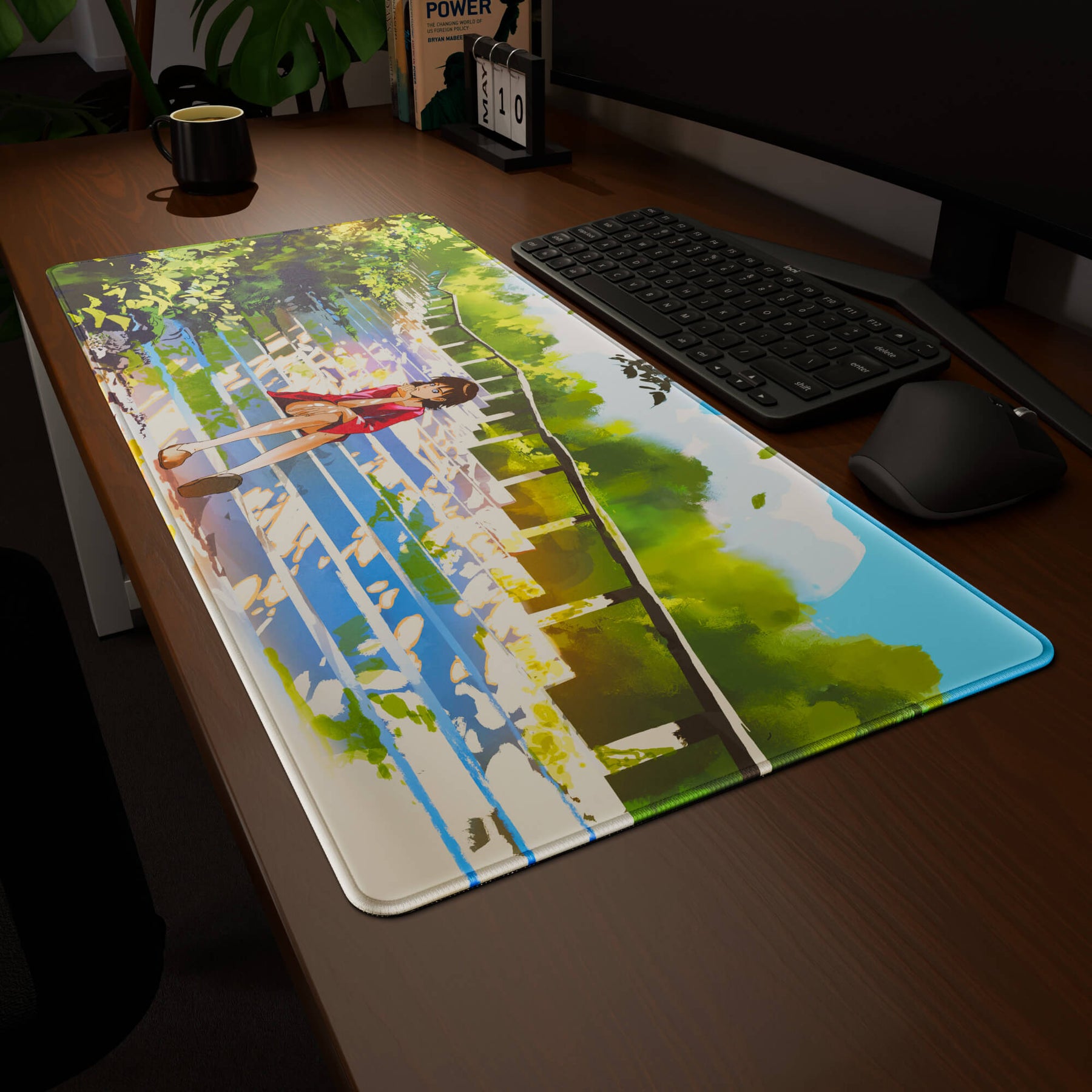 Dynamic angled perspective of a 90x40CM / 35x15.7in large mouse pad / desk mat featuring the vivid 'Peaceful Lofi Girl' design, inspired by lofi and scenic anime art. Its generous dimensions offer a vast, smooth area that protects your desk while enhancing mouse glide and overall comfort.