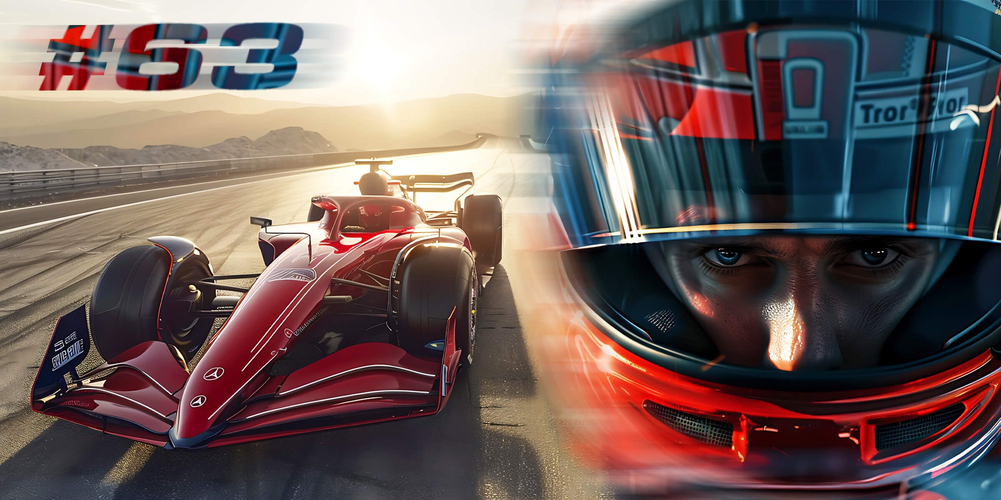 "Please add the racer to where the blue car is. Add some blur effects if possible, and the number 63 to the top left corner. Make it look cool :)"