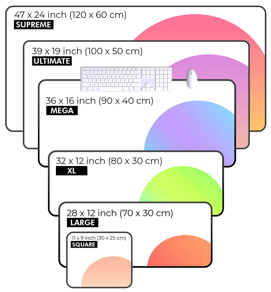 We currently offer SIX mouse pad sizes for you to choose from. They are: